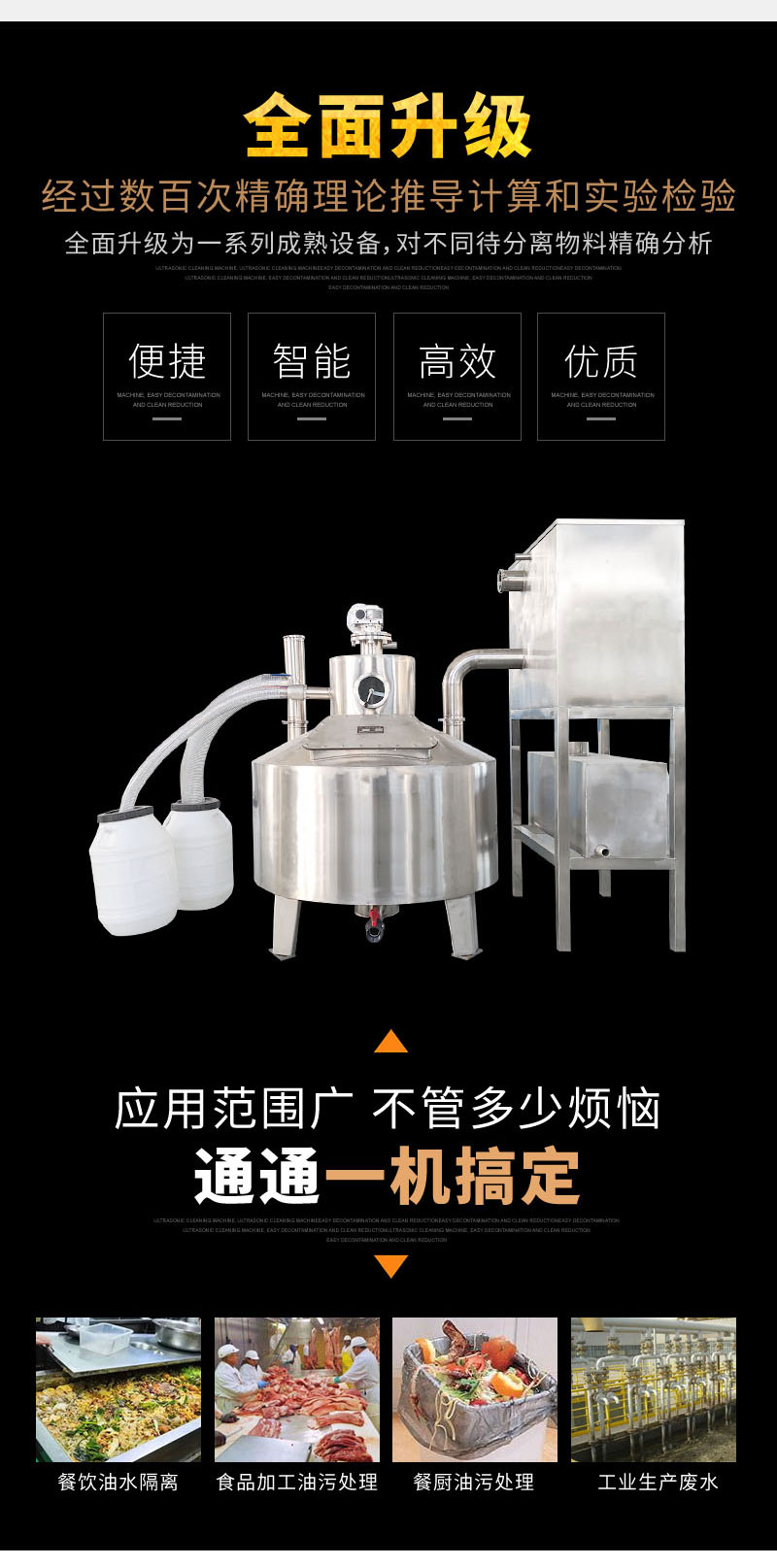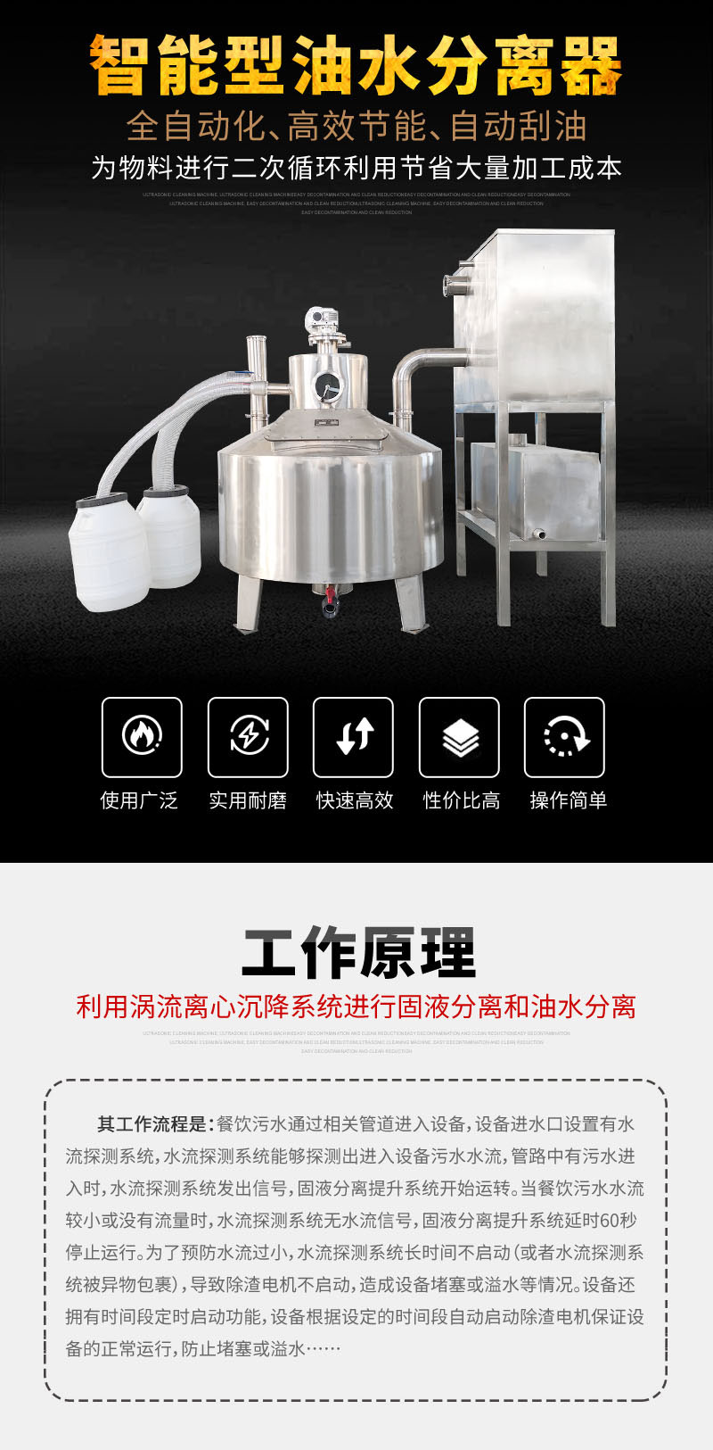 餐飲油水分離器,采用比重分離法+渦流沉降法雙重分離方法,對油水進行分離,油水分離速度快、分油效果佳,該設備具有自動啟停、自動出渣、自動加溫、自動/手動排油、自動排水、故障自動報警等多項功能,低耗能,高產出,模塊化設計,安裝便捷,并可根據用戶現場空間,量身定制,適應于大小不同場所。